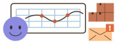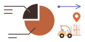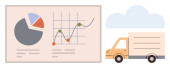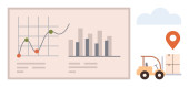 Logistyka, analiza danych, łańcuch dostaw, wydajność, przepływ pracy, wydajność. Szkło powiększające, szczęśliwy wózek widłowy do twarzy i wykres. Koncepcja efektywności logistyki i analizy danych