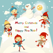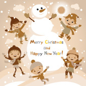 Shiny vector christmas background with funny snowman and children. Happy new year postcard design with boy and girl enjoying the holiday. Winter snow with bokeh effect. 2016 card
