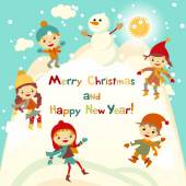 Shiny vector christmas background with funny snowman and children. Happy new year postcard design with boy and girl enjoying the holiday. Winter snow with bokeh effect. 2016 card