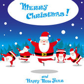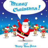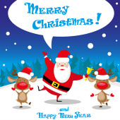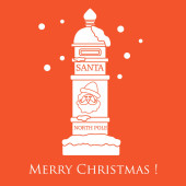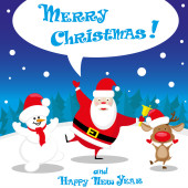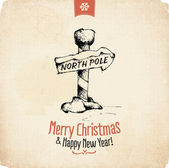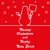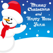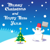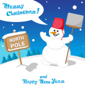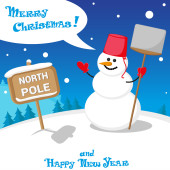 Vector banner funny Snow man in Santa Claus hat on North Pole and Merry Christmas hand drawn text