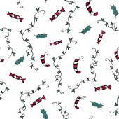 Zimą jasnym tle biały bałwanki i choinki, świąteczne zabawki i kapelusz.