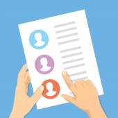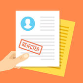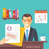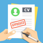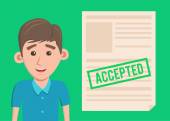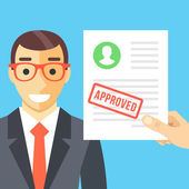 Job application approved. Hand holds job application with approval stamp on it. Flat vector illustration