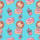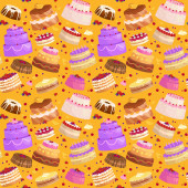 Doodle vector.Bakery,Cakes and dessert,pastries ,lettering seamless pattern.Colored vintage icons,sweet elements background.