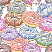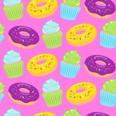 Cute seamless pattern with sweets and dessert, cupcake, ice cream, teapot. Doodle style vector.