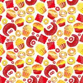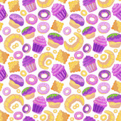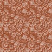Pastry hand drawn seamless pattern. Doodle background collection confections. Icon set vector with donuts, cupcake, dessert, croissant, bagel