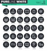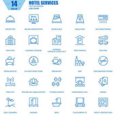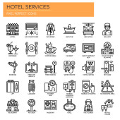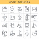 Cienka linia ikony zestaw usług hotelowych i zaplecze, Rezerwacja online, informacje turystyczne. Ikony dla witryny i witryny komórkowej i aplikacje z edytowalnych obrysu.