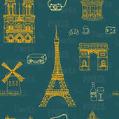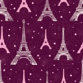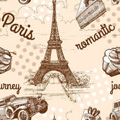 Wektor Vintage brązowy Paris ulice podróży Seamless Pattern z wieży Eifel, domy, drzewa i vintage samochody.