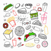 Fast foody wzór z słodycze, cukierki, babeczki i hamburgery