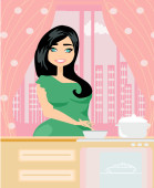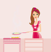Piękna pani gotuje zupę i jajko