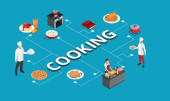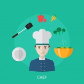 Ilustracja wektorowa w płaskim stylu projektowania. Jedzenie i gotowanie ikony i szef kuchni mężczyzna cartoon charakter w Circle