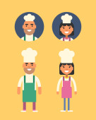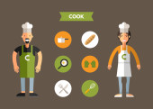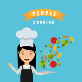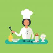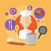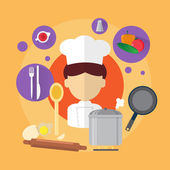 Ilustracja wektorowa w płaskim stylu projektowania. Jedzenie i gotowanie ikony i szef kuchni kobiet cartoon charakter w Circle